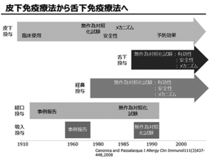 花粉症を含むアレルギー性鼻炎に対する治療として、唯一根治を望める治療法としての免疫療法の役割は大きい。そこには抗原特異的であるアレルゲン免疫療法と非特異的である抗体療法が存在し得る。アレルゲン免疫療法は1911年に Noonが初めて実施して以来、皮下注射によるアレルゲン免疫療法( Subcutaneous Immunotherapy : SCIT)が現在でも標準的なアレルゲン免疫療法として位置づけられている。しかし、1986年に英国における SCITによる致死的なアナフィラキシーに関する調査報告により SCITの安全性に警告がなされたことから、皮下以外の投与経路によるアレルゲン免疫療法が注目され、1986年に最初の舌下投与による免疫療法( Sublingual Immunotherapy : SLIT)の Randomized controlled trialが実施された。その後、数多くの SLITの臨床試験が実施され、1993年にヨーロッパアレルギー臨床免疫学会が Position Paperにて SLITは Hyposensitizationの“ promising route”であることを認め、1998年に WHOが、2001年に WHO―ARIA( Allergic Rhinitis and its Impact on Asthma)が SLITは成人および小児において SCITの代替可能な治療法であることを支持するに至った。また、2009年の WAOの Position Paperには小児も含めて SLITの有用性が明記され、現在、 SCITおよび SLITは、アレルゲン免疫療法の代表的な投与方法として確立されている。